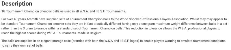 1G Tournament Champion phenolic balls as used in all W.S.A. and I.B.S.F. Tournaments. For over 40 years Aramith have supplied sets of Tournament Champion balls to the World Snooker Professional Players Association. Whilst they may appear to be standard Tournament Champion snooker sets they are in fact drastically different having only a one gram maximum weight difference between balls in a set rather than the 3 gram tolerance within a standard set of Tournament Champion balls. This reduction in tolerance allows the W.S.A. professional players to reach the highest scores during W.S.A. Tournaments. Made in Belgium. The balls are supplied in an elegant storage case (branded with both the W.S.A and I.B.S.F. logos) to enable players wanting to emulate tournament conditions to carry their own set of balls.