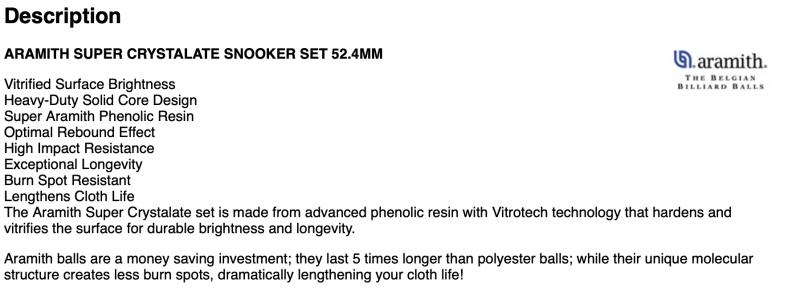 Aramith Super Crystalate Snooker Set 52.4mm Vitrified Surface Brightness Heavy-Duty Solid Core Design