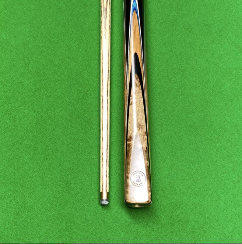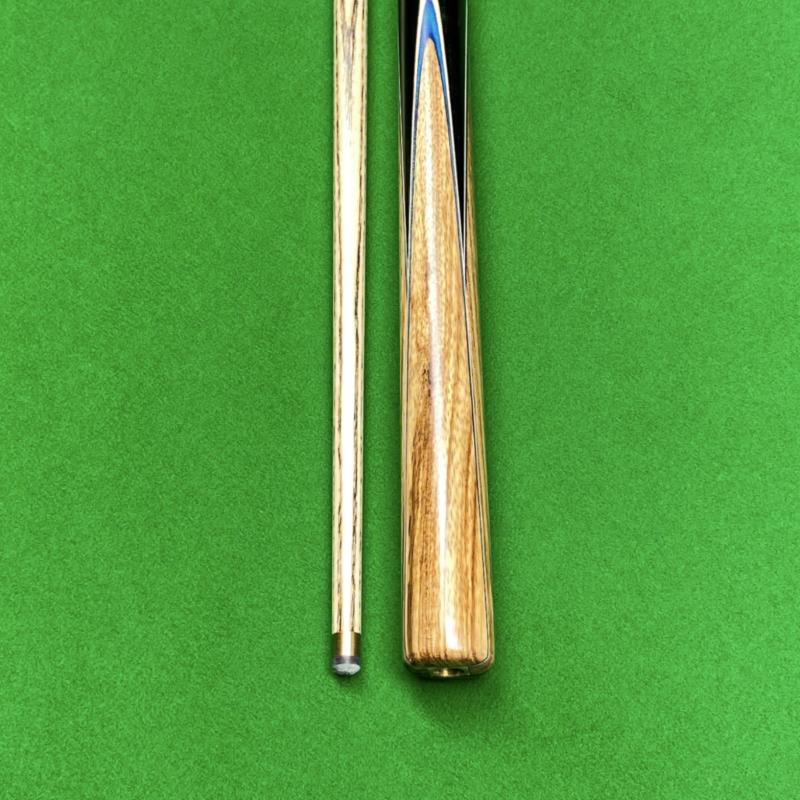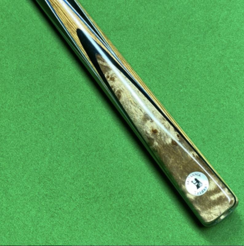 This full-size, one piece 57″ (145 cm) British pool cue is made from kiln dried top-grade North American ash, selected to the absolute highest standard. Traditional hand splicing techniques are used to combine the highest grade straight grained, stiff ash with the blackest and densest Gabon ebony, the butt is then further hand spliced with 5 splices of Zebrano wood and highly figured Eucalyptus Burrwood which is then enhanced with 8 natural and blue Sycamore veneer inlays and a further thick black Ebony inlay . A high tensile machined quick release brass joint is fitted in the base of the butt. This allows precise, reliable and rapid action when using the included 6 inch (15 cm) mini butt which means you can lengthen your cue for extra reach shots. The High tensile matching brass ferrule is precisely fitted to the cue to strengthen the ash tip and enables us to offer this cue in small tip sizes from 6.5 to 8.5mm. Traditional chrome tanned leather medium Grand tips are fitted, compressed and even shaped for your convenience. This cue includes a weighted and badged 6 inch (15 cm) mini butt when fitted extends the cue to 63 inch (160 cm) length. The smoothed and hand finished butt flat and the mini butt are both adorned with a unique individual genuine Mother of Pearl Britannia disc badge which is engraved and black enamelled setting off this stunning cue.